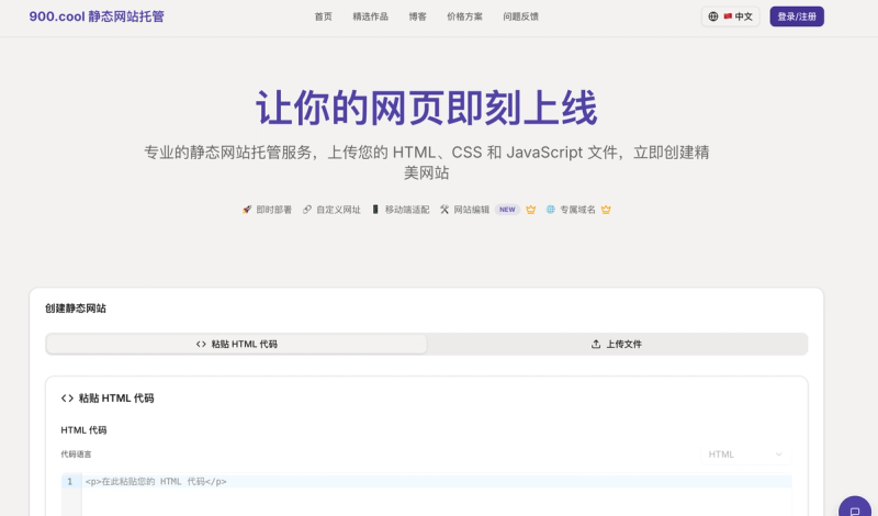 900.cool offers a professional static website hosting platform for instant deployment of HTML, CSS, and JavaScript files with custom domains.