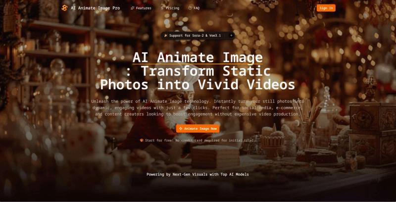 Key Features: Multiple AI Models: Access the most mainstream and state-of-the-art AI video generation models for diverse animation styles Flexible Output: Choose from 480p, 720p, and 1080p resolutions with 5s, 8s, or 10s durations Smart Controls: Optional text prompts for precise animation control, or let AI auto-animate your images Instant Results: Generate videos in under 60 seconds with a 3-step workflow High Success Rate: 95%+ generation reliability with credit-back guarantee on failures Freemium Model: Start with free credits and upgrade as you grow Why Choose AI Animate Image? Unlike complex video editing software requiring weeks of learning, our platform delivers professional results without the steep learning curve. Whether you're creating viral TikTok content, showcasing e-commerce products, or bringing family memories to life, AI Animate Image makes professional video animation accessible to everyone.