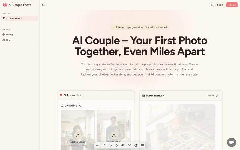AI Couple is an innovative tool that transforms two individual photos into stunning AI-generated couple images and romantic videos. It's designed for couples who want to create shared memories even when physically apart. Key features include: