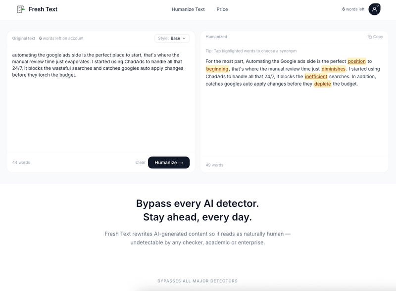 Fresh Text is an advanced AI-powered tool designed to humanize AI-generated content, making it undetectable by popular AI detectors like Turnitin, GPTZero, and Scribbr.