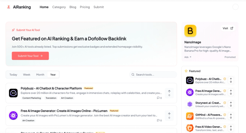 AiRanking is a comprehensive platform that curates and ranks AI tools across various categories. It provides detailed insights into top-performing AI solutions, helping users discover tools for writing, image generation, and more. The platform also allows users to submit their own AI tools for consideration.
