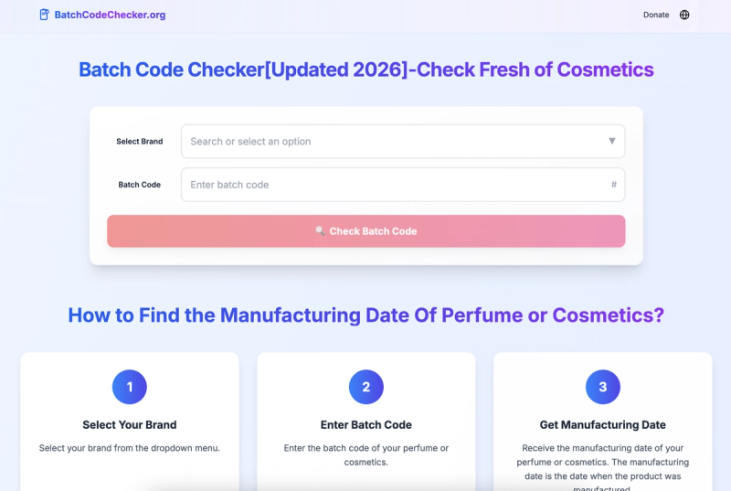 Batch Code Checker is a free online tool that helps users determine the production date, shelf life, and version information of perfumes and cosmetics by analyzing their batch codes. Key features include:
