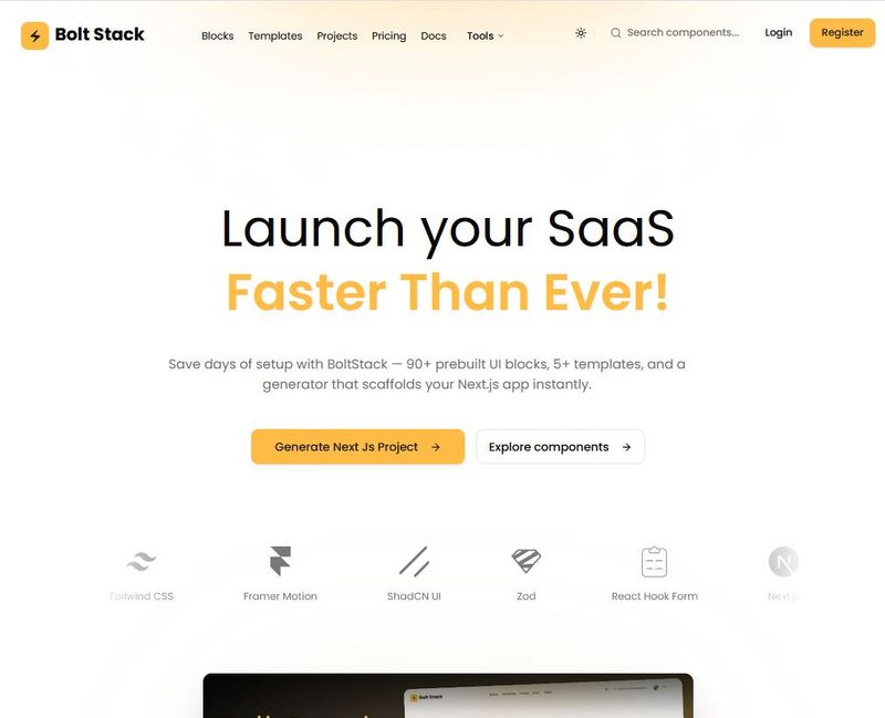 Ship your SaaS in days with the BoltStack Saas engine. A high-performance Next.js boilerplate merging 80+ Shadcn UI blocks with a battle-tested full-stack architecture. Inside: -Advanced Auth & DB: NextAuth.js + Drizzle (Postgres). -Payments: PayPal subscriptions + Billing UI. -CMS: Sanity.io Blog + Advanced MDX Docs. -Email: Resend/Mailchimp + React templates. -Stack: Upstash Redis, GA4 SEO, & Framer Motion. Stop configuring. BoltStack handles the "boring stuff" so you can build.