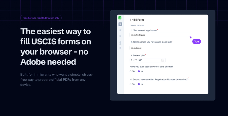 Complete USCIS forms like DS-160, I-90, and AR-11 instantly - right in your browser. Fillvisa is free, private, and 100% local: no signups, no uploads, and no d