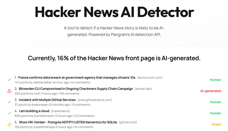 A tool to detect if a Hacker News story is likely to be AI-generated. Powered by Pangram AI Detection API.