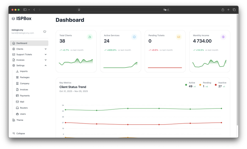 ISPBox is a comprehensive management platform designed specifically for Internet Service Providers (ISPs). It offers a centralized solution for client management, billing automation, and network operations. Key features include: