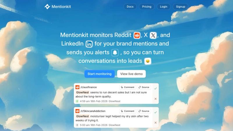 Mentionkit is a powerful social listening & monitoring tool designed to help businesses and teams track brand mentions and conversations across Reddit, X/Twitter, and LinkedIn. It helps you identify high-intent posts early, and sends you alerts for them, so you can engage potential leads.