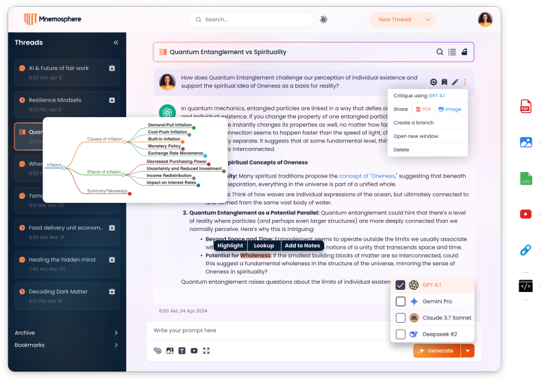 Mnemosphere is a cutting-edge AI research workspace designed for power users who need more than standard chatbot interfaces. It combines multiple frontier AI models (GPT-5.4, Claude 4.6, Gemini 3.1, Grok 4.1) in one interface with unique features like: