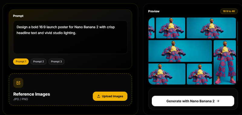 Nano Banana 2 is a fast AI image generation and editing solution built for creators, marketers, and developers. It delivers speed with reference-image grounding, precise instruction following, cleaner in-image text rendering, and strong subject consistency across edits, variations, and storyboard-style sequences. With capabilities like 4K-ready output control, text translation/localization, and multi-image guided editing, it helps you iterate quickly and export higher-fidelity visuals for marketing and production workflows.