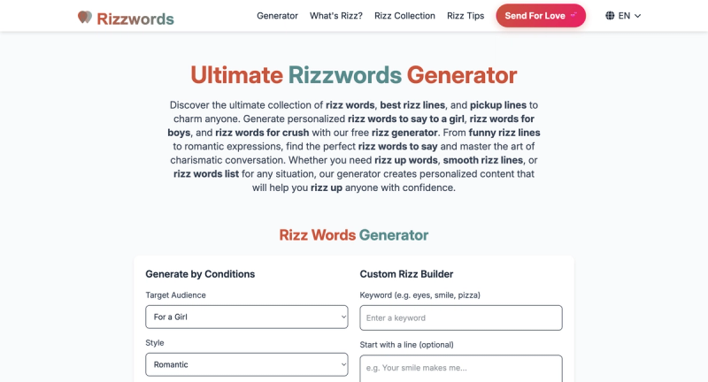 Generate the best rizz words, pickup lines & flirting phrases. Free rizz generator for girls, boys & crushes with funny, romantic & smooth lines.