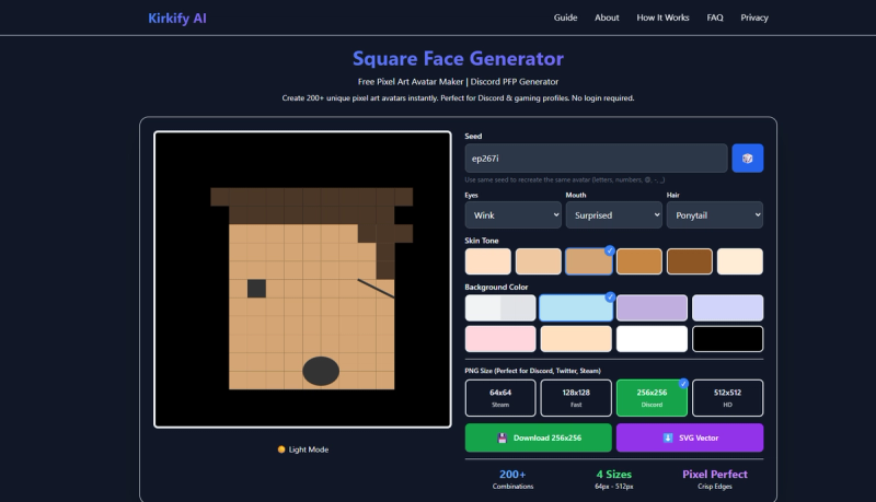 Create unique pixel art avatars instantly with Square Face Generator! Our free square face icon generator offers 200+ combinations of 8 eye styles, 12 hair styles, and 6 mouth styles to create the perfect avatar for your Discord PFP, gaming profile, or social media account.