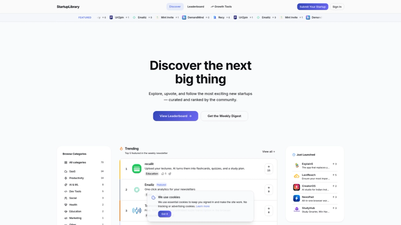 - Category Discovery: Browse startups by industry categories like AI, SaaS, and Marketing