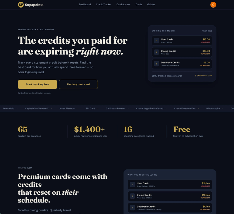 Supapoints is a free credit card benefit tracking platform built for people who want to maximize the value of the cards they already carry. Most cardholders leave hundreds of dollars in annual benefits unused — airline credits that expire, dining credits they forget about, Global Entry reimbursements they never claim. Supapoints solves this by letting you add your cards, see every benefit with its expiration timeline, and mark perks as used so nothing slips through the cracks. The built-in Card Advisor analyzes your actual monthly spending across 16 categories and ranks 65+ cards by net annual value for your profile, so you can see exactly which cards earn you the most. No bank linking, no subscriptions, no data harvesting — just a clean dashboard that helps you stop leaving money on the table.