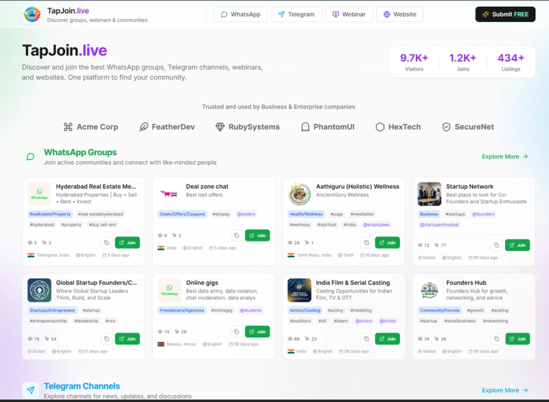 TapJoin.live is a comprehensive discovery hub for digital communities across multiple platforms. It indexes and showcases active WhatsApp groups, Telegram channels, webinars, and curated websites, providing a centralized interface for users to find and join communities of interest.
