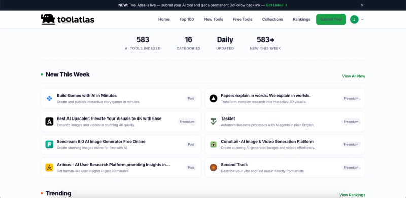 Tool Atlas is a comprehensive AI tools directory that helps users discover, compare, and track the best artificial intelligence tools across various categories. Key features include: