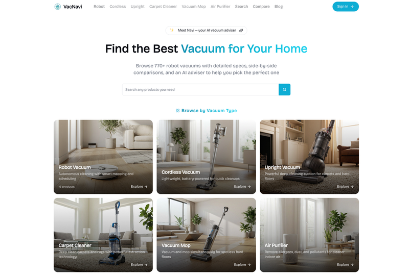 VacNavi is an AI-powered platform designed to help users find the perfect vacuum and cleaning products for their homes. It offers a comprehensive database of over 770 robot vacuums with detailed specifications, side-by-side comparisons, and an AI adviser named Navi that provides personalized recommendations based on budget, home type, and cleaning priorities. Key features include: