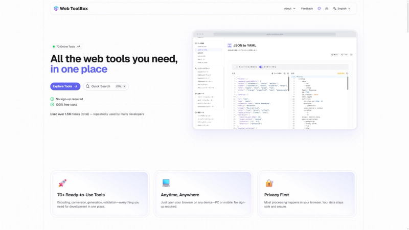 Web ToolBox is a collection of free online tools that lightly support development and design work. Over 70 meticulously crafted tools can be used instantly from your browser, making your daily coding and production flow much easier.